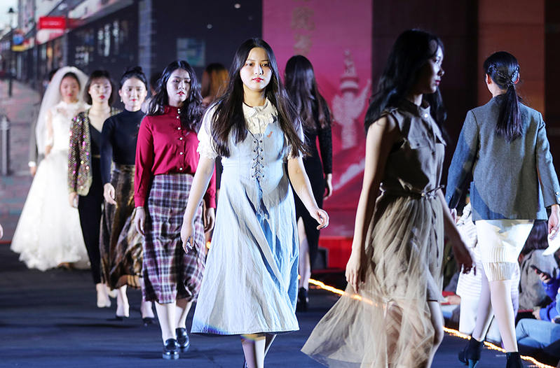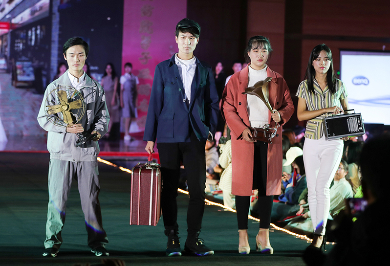 服装,是社会文化的产物,承载着人们深层次的精神需求。改革开放以来,社会生产力飞速发展,这四十年中人们衣着的变化,是物质文明和精神文明共同进步的写照。在《青苹果乐园》《童年》《外婆的澎湖湾》《光辉岁月》《明天会更好》等80、90年代的经典旋律中,以学院2018级新生为主体的50余名同学向观众们展示了改革开放四十年来有代表性的生活物件、现代蓝印花布服饰、中华历代经典服饰、流行影视服饰以及现代礼服等。T台上,一件件喇叭裤、花色格子裙、高腰卫衣、格子背心裙、网纱短袖、健美裤、雪纺连衣裙、丝绒长袖旗袍、雪纺泡泡袖上衫、百褶裙、婚纱西服、老式二八加重自行车、留声机、收音机、老式电风扇、皮箱等让现场观众重温了改革开放四十年带来的巨大变化,共展出服饰、物件60余种。最终,晚会在音诗画《盛世中国》的激情朗诵中落下帷幕。
