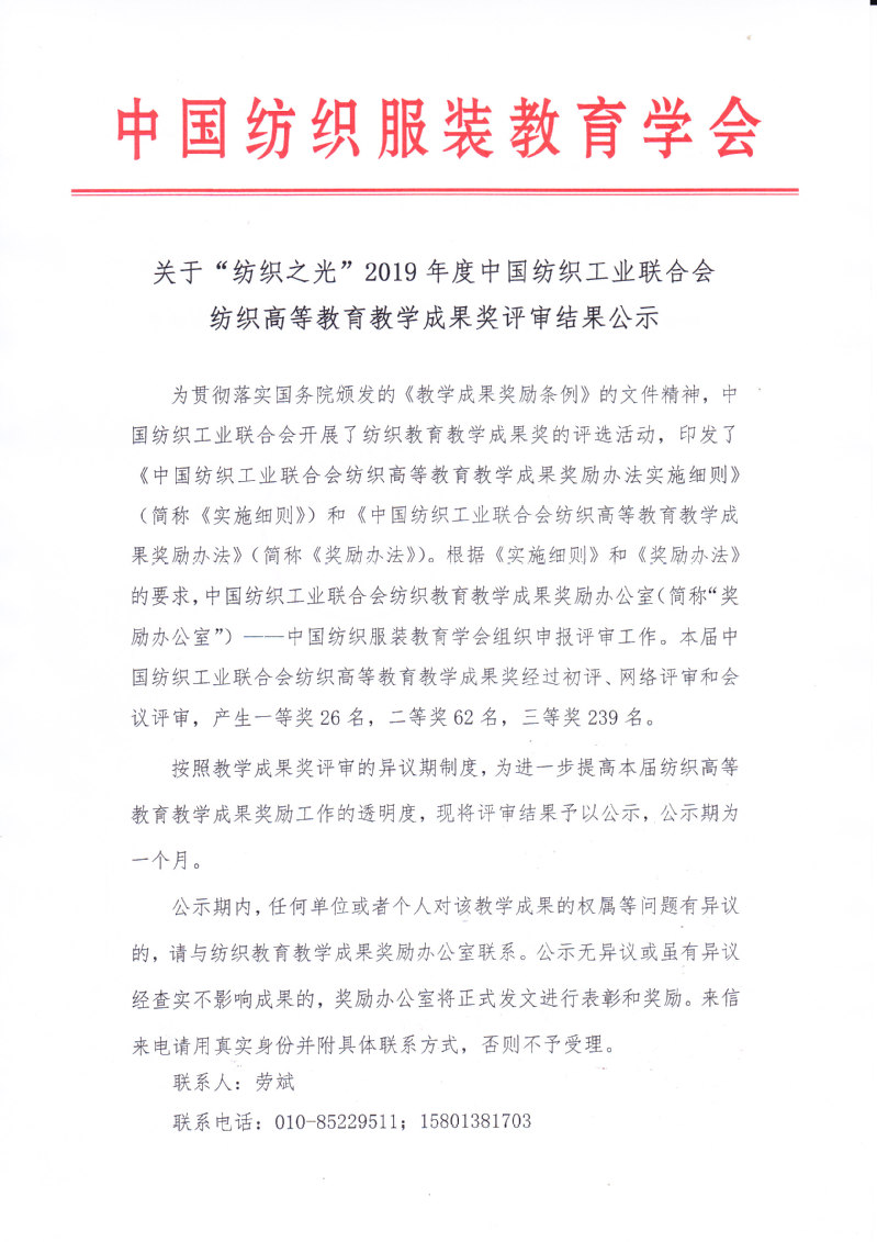 关于“纺织之光”2019年度中国纺织工业联合会纺织高等教育教学成果奖评审结果公示