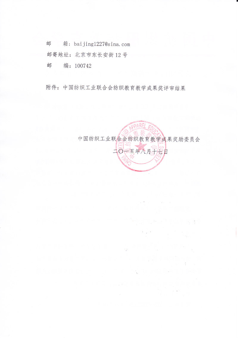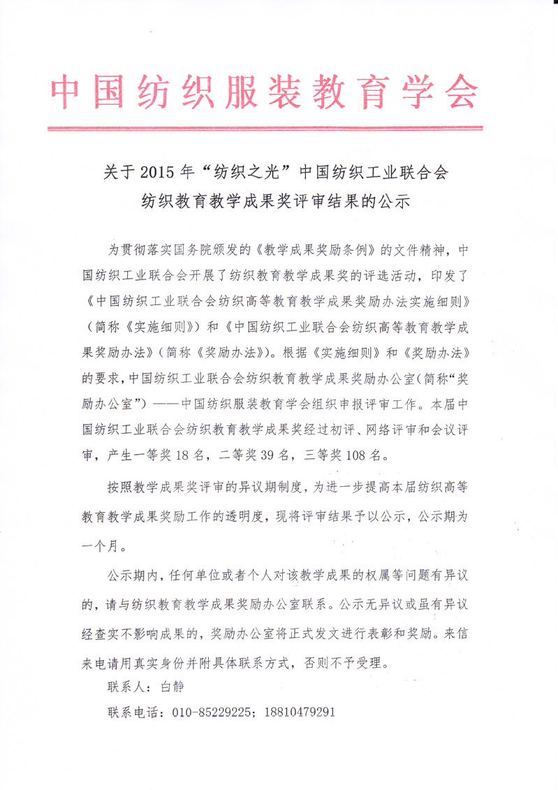 关于2015年“纺织之光”中国纺织工业联合会纺织教育教学成果奖评审结果的公示