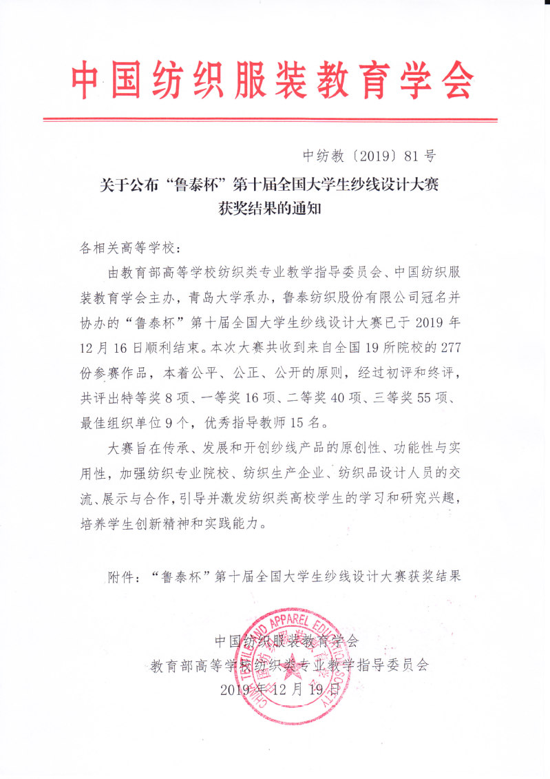 关于公布“鲁泰杯”第十届全国大学生纱线设计大赛获奖结果的通知