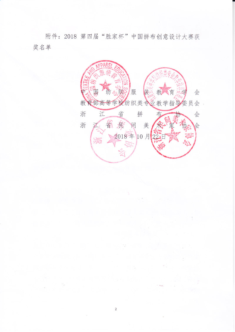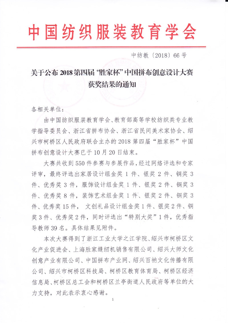 关于公布2018第四届“胜家杯”中国拼布创意设计大赛获奖结果的通知