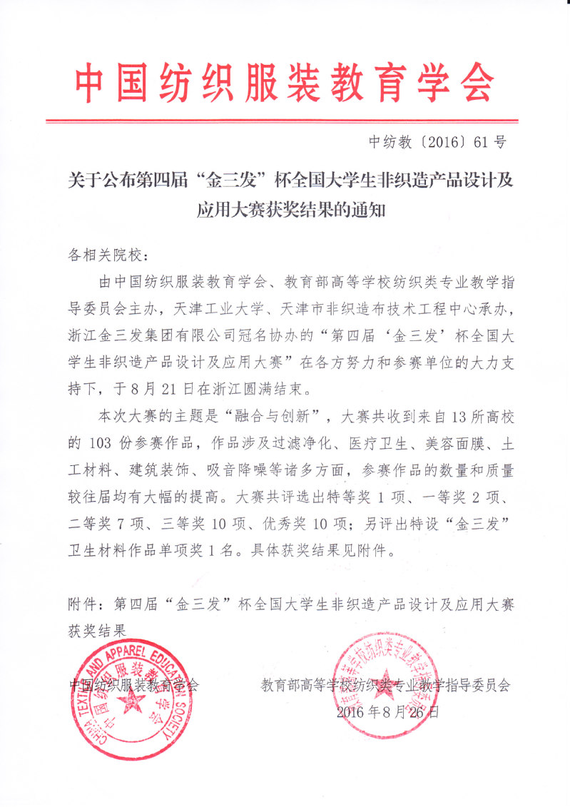 关于公布第四届“金三发”杯全国大学生非织造产品设计及应用大赛获奖结果的通知