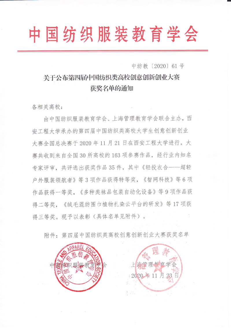 关于公布第四届中国纺织类高校创意创新创业大赛获奖名单的通知
