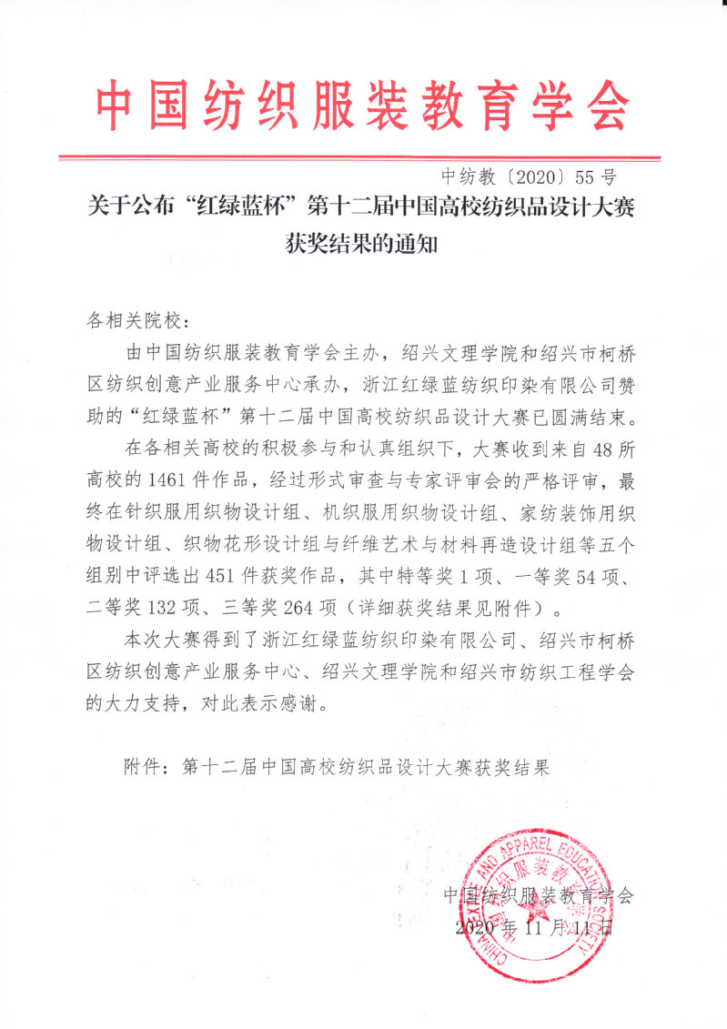 关于公布“红绿蓝杯”第十二届中国高校纺织品设计大赛获奖结果的通知