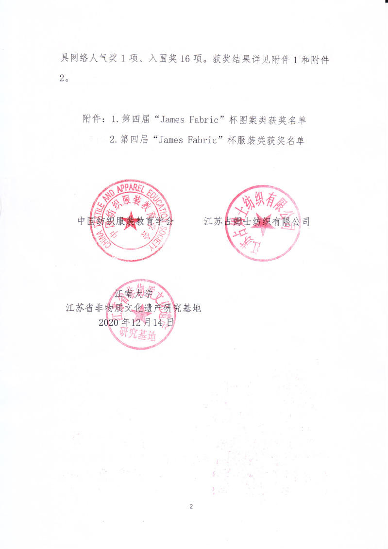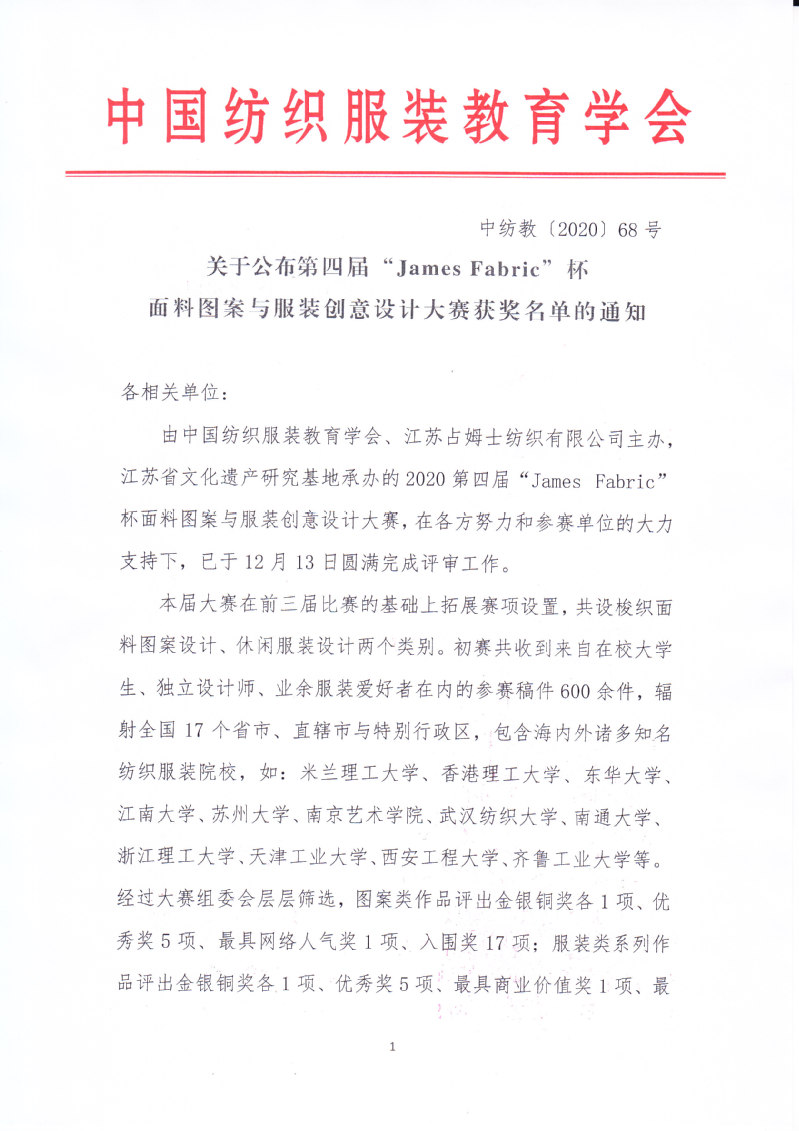 关于公布第四届“James Fabric”杯面料图案与服装创意设计大赛获奖名单的通知