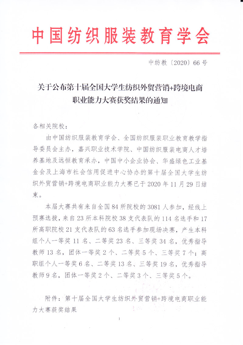 关于公布第十届全国大学生纺织外贸营销+跨境电商职业能力大赛获奖结果的通知