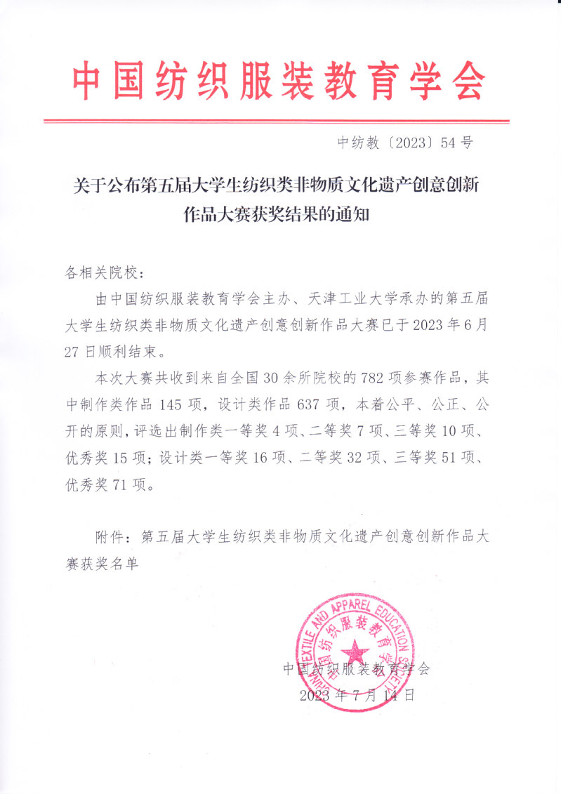 关于公布第五届大学生纺织类非物质文化遗产创意创新作品大赛获奖结果的通知
