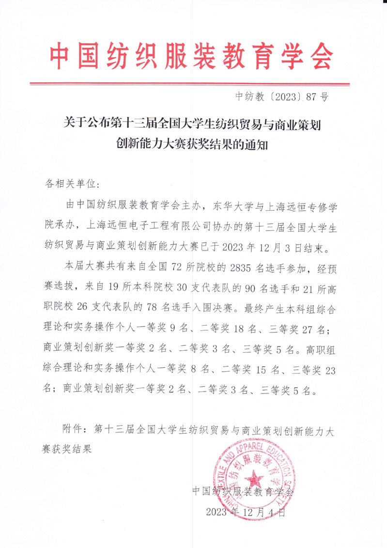 关于公布第十三届全国大学生纺织贸易与商业策划创新能力大赛获奖结果的通知