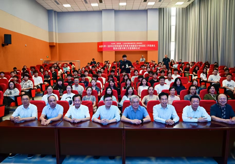 9月19日,2025年中国非物质文化遗产传承人研修培训计划——蓝印花布印染技艺传承与创新设计培训班在我校开班。文化和旅游部原副部长项兆伦、校长王建浦出席开班式,并共同为“吴元新大师工作室”揭牌。江苏省国资委原党委副书记、副主任、一级巡视员、江苏省工艺美术学会会长沈建生出席开班仪式并讲话。校党委副书记王卫东主持开班式,并宣读工作室带徒名单。