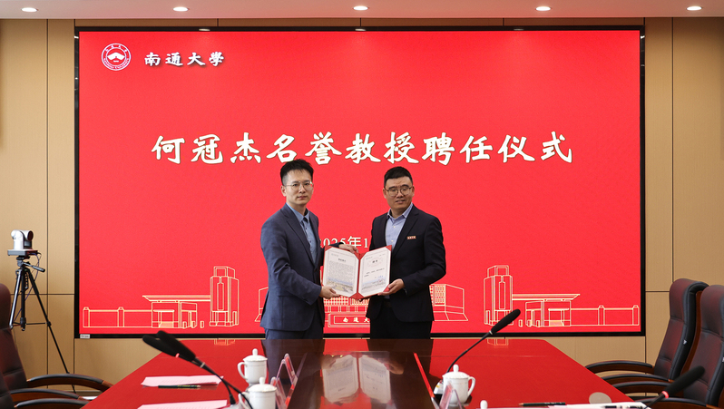 王建浦代表学校对何冠杰受聘为我校名誉教授表示诚挚的欢迎和衷心的感谢,并介绍了我校的基本情况。他表示,何冠杰教授在新型材料制备、先进表征与模拟,以及其在水系电化学储能和转化领域的研究与应用中享有盛誉,还在锌基储能系统的研究与商业化方面取得了卓越成就,这种跨学科的创新思维,正是高校培养顶尖人才、推动学科突破所急需的。何教授的加盟,一定会带来前沿的学科发展动向和研究理念,助力我校学科团队对接全球顶尖资源,培养更多兼具创新精神与实践能力的青年人才,不断扩大我校与国外高水平大学的科研合作,持续提升学校的科学研究水平和社会影响力。